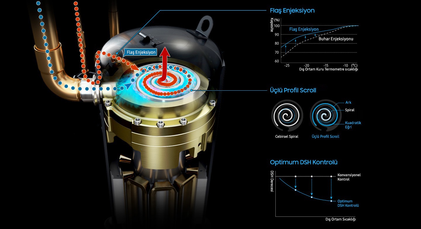 * Samsung, 14,400cc/sn soğutucu akışkan sirkülasyonu gerçekleştirir. A firması 12,480cc/sn, B firması 14,080cc/sn, C firması 12,320cc/sn. ** DSH: Discharge Superheat.